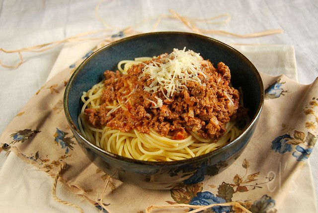 Tiens des spaghettis. Zut, je n’ai plus de sauce bolognaise toute faite.